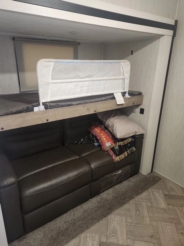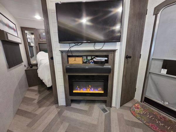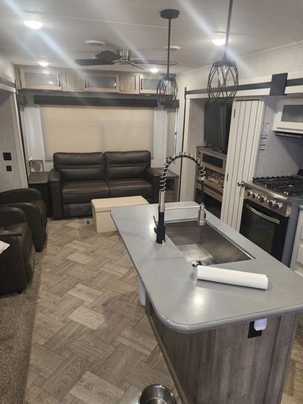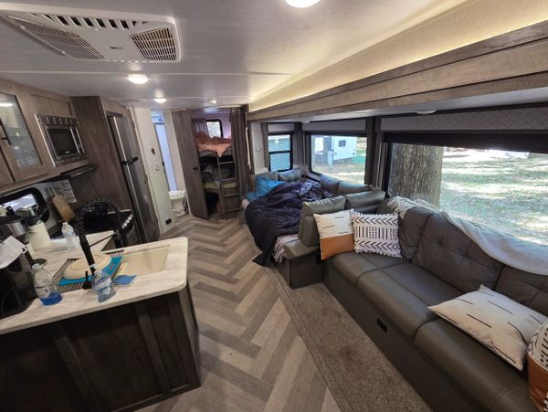 Spacious 2021 Puma 38RLB Destination Trailer with Bunkhouse—Your perfect home-away-from-home & 2013 Yamaha Golf Cart - Private front bedroom with a queen bed and a middle bunkhouse with a convertible tri-fold sofa provide sleeping arrangements for up to eight people. - Large kitchen island, residential-size refrigerator, walk-in pantry, and a stainless steel oven give you everything you need for gourmet cooking. -Enjoy the open rear living area with theater-style recliners, a pull-out sofa, and an electric fireplace. Asking price - $34,000 - please reach out to 920-939-1043