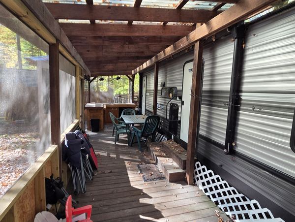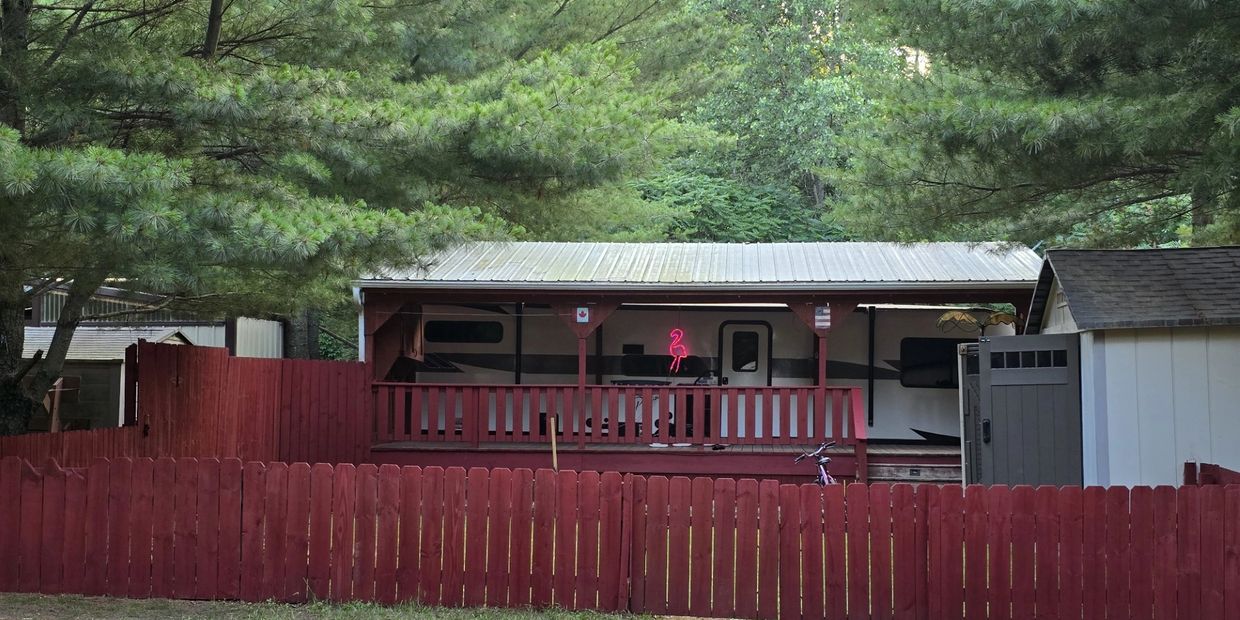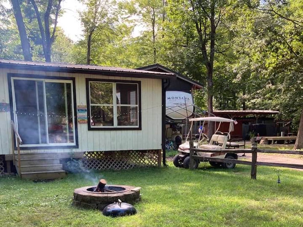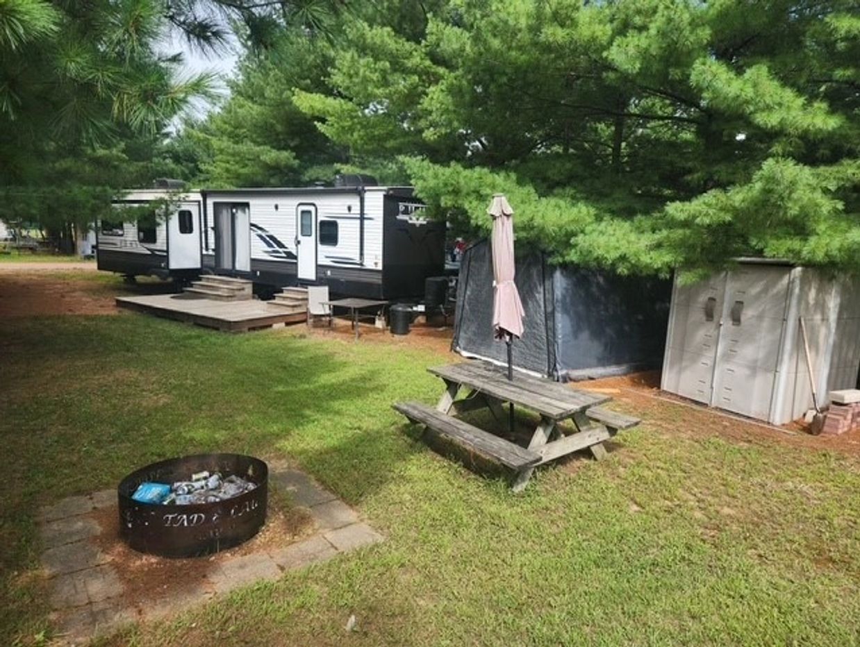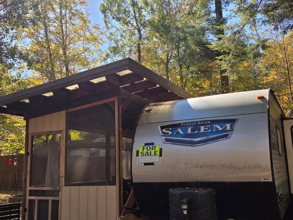 $29,900 for rarely used 2021 Salem Forest River camper, with mostly screened in deck area with bar seating, fenced in firepit area with privacy fence on one side, and large shed with overhead door. Golf cart with charger available for additional $2,000. Across from a playset in a private, quiet area of the campground. The camper is stocked with everything you need - bedding, dishes/cookware/utensils, towels, etc. There are floaties, some tools, and new barstools for the bar area in the shed, plus a covered area for firewood that is partially stocked. Call Scott at 920-810-5590